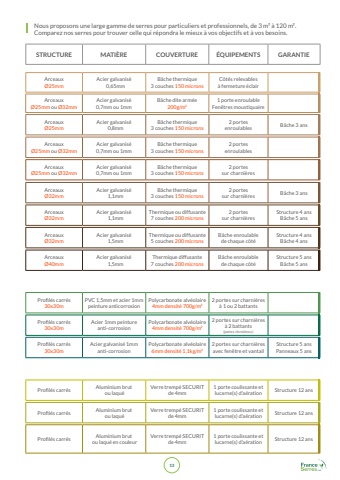 13STRUCTURE MATI%u00c8RE COUVERTURE %u00c9QUIPEMENTS GARANTIENous proposons une large gamme de serres pour particuliers et professionnels, de 3 m%u00b2 %u00e0 120 m%u00b2. Comparez nos serres pour trouver celle qui r%u00e9pondra le mieux %u00e0 vos objectifs et %u00e0 vos besoins.Arceaux %u00d825mmAcier galvanis%u00e9 0,65mmB%u00e2che thermique3 couches 150 micronsC%u00f4t%u00e9s relevables %u00e0 fermeture %u00e9clairArceaux %u00d825mm ou %u00d832mmAcier galvanis%u00e9 0,7mm ou 1mmB%u00e2che dite arm%u00e9e200g/m%u00b21 porte enroulableFen%u00eatres moustiquaire Arceaux %u00d825mmAcier galvanis%u00e9 0,8mmB%u00e2che thermique3 couches 150 microns2 portesenroulables B%u00e2che 3 ansArceaux %u00d825mm ou %u00d832mmAcier galvanis%u00e9 0,7mm ou 1mmB%u00e2che thermique3 couches 150 microns2 portesenroulablesArceaux %u00d825mm ou %u00d832mmAcier galvanis%u00e9 0,7mm ou 1mmB%u00e2che thermique3 couches 150 microns2 portessur charni%u00e8resArceaux %u00d832mmAcier galvanis%u00e9 1,1mmB%u00e2che thermique3 couches 150 microns2 portessur charni%u00e8res B%u00e2che 3 ansArceaux %u00d832mmAcier galvanis%u00e9 1,1mmThermique ou diffusante 7 couches 200 microns2 portessur charni%u00e8res Structure 4 ans B%u00e2che 5 ansArceaux %u00d832mmAcier galvanis%u00e9 1,5mmThermique ou diffusante 5 couches 200 micronsB%u00e2che enroulablede chaque c%u00f4t%u00e9Structure 4 ans B%u00e2che 4 ansArceaux %u00d840mmAcier galvanis%u00e9 1,5mmThermique diffusante 7 couches 200 micronsB%u00e2che enroulablede chaque c%u00f4t%u00e9Structure 5 ans B%u00e2che 5 ansProfil%u00e9s carr%u00e9s 30x30mPVC 1,5mm et acier 1mm peinture anticorrosionPolycarbonate alv%u00e9olaire 4mm densit%u00e9 700g/m%u00b22 portes sur charni%u00e8res %u00e0 1 ou 2 battants Profil%u00e9s carr%u00e9s 30x30mAcier 1mm peintureanti-corrosionPolycarbonate alv%u00e9olaire 4mm densit%u00e9 700g/m%u00b22 portes sur charni%u00e8res %u00e0 2 battants (portes %u00abfermi%u00e8res%u00bb)Profil%u00e9s carr%u00e9s 30x30mAcier galvanis%u00e9 1mmanti-corrosionPolycarbonate alv%u00e9olaire 6mm densit%u00e9 1,1kg/m%u00b22 portes sur charni%u00e8res avec fen%u00eatre et vantailStructure 5 ans Panneaux 5 ansProfil%u00e9s carr%u00e9s Aluminium brut ou laqu%u00e9Verre tremp%u00e9 SECURIT de 4mm1 porte coulissante et lucarne(s) d%u2019a%u00e9ration Structure 12 ansProfil%u00e9s carr%u00e9s Aluminium brut ou laqu%u00e9Verre tremp%u00e9 SECURIT de 4mm1 porte coulissante et lucarne(s) d%u2019a%u00e9ration Structure 12 ansProfil%u00e9s carr%u00e9s Aluminium brut ou laqu%u00e9 en couleurVerre tremp%u00e9 SECURIT de 4mm1 porte coulissante et lucarne(s) d%u2019a%u00e9ration Structure 12 ans