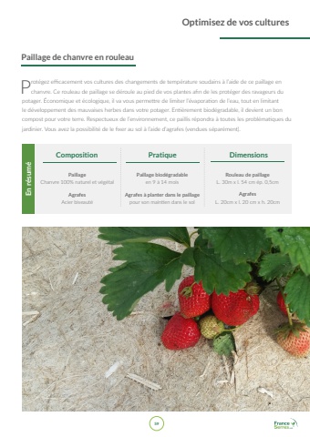 59Rouleau de paillageL. 30m x l. 54 cm %u00e9p. 0,5cmAgrafesL. 20cm x l. 20 cm x h. 20cmDimensionsPaillage biod%u00e9gradableen 9 %u00e0 14 moisAgrafes %u00e0 planter dans le paillagepour son maintien dans le solPratiquePaillageChanvre 100% naturel et v%u00e9g%u00e9talAgrafesAcier biseaut%u00e9CompositionEn r%u00e9sum%u00e9Prot%u00e9gez efficacement vos cultures des changements de temp%u00e9rature soudains %u00e0 l%u2019aide de ce paillage enchanvre. Ce rouleau de paillage se d%u00e9roule au pied de vos plantes afin de les prot%u00e9ger des ravageurs dupotager. %u00c9conomique et %u00e9cologique, il va vous permettre de limiter l%u2019%u00e9vaporation de l%u2019eau, tout en limitantle d%u00e9veloppement des mauvaises herbes dans votre potager. Enti%u00e8rement biod%u00e9gradable, il devient un boncompost pour votre terre. Respectueux de l%u2019environnement, ce paillis r%u00e9pondra %u00e0 toutes les probl%u00e9matiques dujardinier. Vous avez la possibilit%u00e9 de le fixer au sol %u00e0 l%u2019aide d%u2019agrafes (vendues s%u00e9par%u00e9ment).Paillage de chanvre en rouleauOptimisez de vos cultures