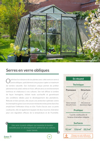 40 Surfaces9,1 m%u00b2 13,6 m%u00b2 22,5 m%u00b21 porte coulissante et lucarne d%u2019a%u00e9ration int%u00e9gr%u00e9ePratiqueStructureVerre tremp%u00e9 S%u00e9curit 4 mmPanneauxStructure en aluminium l%u00e9gerTechniqueEn r%u00e9sum%u00e9Une serre %u00e0 parois obliques qui maximise la lumi%u00e8re naturelle pour un d%u00e9veloppement optimal de vos cultures, toute l%u2019ann%u00e9e.%u00ab %u00ab Optimisez la croissance de vos plantes avec cette serre enverre %u00e0parois obliques, sp%u00e9cialement con%u00e7ue pour capterun maximumde lumi%u00e8re naturelle. Son inclinaison unique permet de profiterpleinement du soleil, m%u00eame en hiver, offrant ainsi un environnementlumineux et chaleureux %u00e0 vos cultures. Son toit diffuse la lumi%u00e8rede fa%u00e7on homog%u00e8ne, %u00e9vitant toute surchauffe et garantissantdes conditions id%u00e9ales pour le d%u00e9veloppement des plantations.Robuste et bien pens%u00e9e, elle assure une protection optimale contreles intemp%u00e9ries gr%u00e2ce %u00e0une structure r%u00e9sistante etdes joints %u00e9tanchesemp%u00eachant l%u2019infiltration d%u2019eau et d%u2019air. Facile d%u2019acc%u00e8s avec sa portecoulissante, elle est %u00e9galement %u00e9quip%u00e9e de deux lucarnes d%u2019a%u00e9rationpour une r%u00e9gulation efficace de la temp%u00e9rature et de l%u2019humidit%u00e9.Serre polycarbonate DEMI-LUNE 12m%u00b2Serres en verre obliquesSerre en verre oblique 9,1 m%u00b2Cliquez sur une taille pourconsulter la fiche technique
