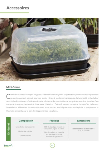 62 Dimension de la mini-serre :36 x 26 x 19cmDimensions100 % plastique recycl%u00e9 etrecyclable, rigide et solideBac de culture et coupelle en plastique noir matr%u00e9sistant au gel et UVPratiqueUne cloche transparenteUn bac de cultureUne soucoupeCompositionEn r%u00e9sum%u00e9Commencez votre saison plus t%u00f4t gr%u00e2ce %u00e0 cette mini-serre de jardin. Sa petite taille permet de cr%u00e9errapidementun environnement optimal pour vos semis. Gr%u00e2ce %u00e0 sa cloche transparente, la luminosit%u00e9 et la chaleurseront plus importantes %u00e0 l%u2019int%u00e9rieur de cette mini-serre. La germination de vos graines sera ainsi favoris%u00e9e. Soncouvercle transparent est %u00e9quip%u00e9 d%u2019une valve d%u2019a%u00e9ration . Cet outil va vous permettre de contr%u00f4ler facilementla ventilation %u00e0 l%u2019int%u00e9rieur de votre mini-serre. Vous pourrez ainsi r%u00e9guler en toute simplicit%u00e9 la temp%u00e9rature etl%u2019humidit%u00e9 ambiant pour le bon d%u00e9veloppement de vos plants.Mini-SerreAccessoires