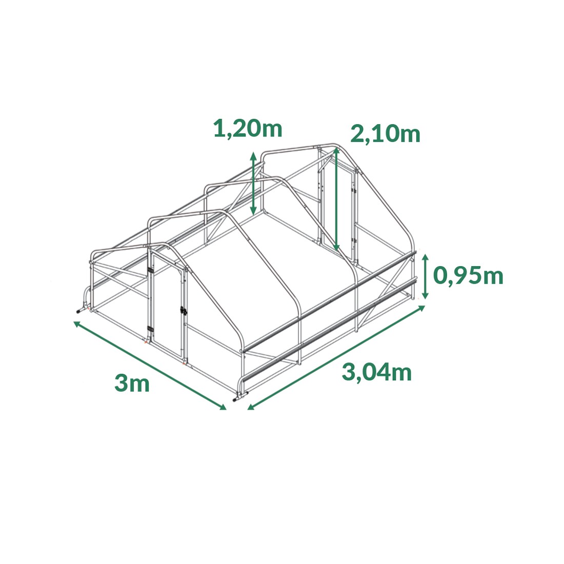 Cette serre s'appuie sur une ossature robuste en acier galvanisé avec des arceaux de 32mm de diamètre et 1mm d'épaisseur, pour une stabilité maximale face aux intempéries. Sa bâche en polyéthylène transparente de 200 microns 7 couches offre un microclimat propice à une croissance saine de vos plantations grâce à son traitement anti-UV.